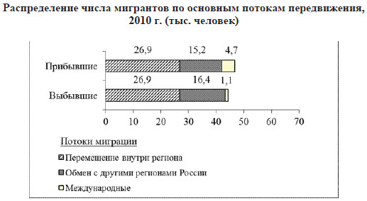 Распределение числа мигрантов по основным потокам передвижения, 2010 г. (тыс. человек)