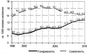 Вопрос id:414861 Тема/шкала: 21.Направление и типы миграции населения России Используя график, определите показатель естественного прироста населения в России в 2010 г. Показатели рождаемости и смертности в России