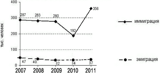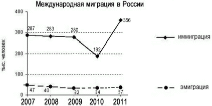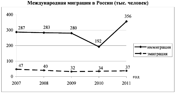 Вопрос id:414867 Тема/шкала: 21.Направление и типы миграции населения России Используя данные графика, определите показатель миграционного прироста населения в России в 2011 г. Международная миграция в России