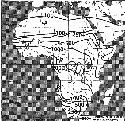 Запишите получившуюся последовательнось букв. Вопрос id:414972 Тема/шкала: 22.Природные ресурсы С помощью карты сравните среднегодовое количество осадков в точках, обозначенных на карте буквами А, Б, В. Расположите эти точки в порядке увеличения количества осадков, выпадающих в них.