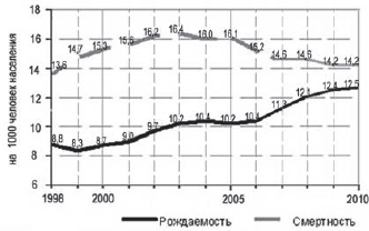 Показатели рождаемости и смертности в России на 1000 человек населения.