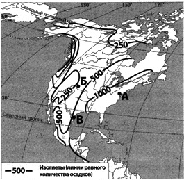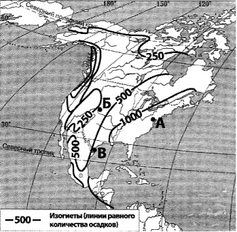 Запишите в ответ получившуюся последовательность букв. Вопрос id:414987 Тема/шкала: 22.Природные ресурсы С помощью карты сравните среднегодовое количество осадков в точках, обозначенных на карте буквами А, Б, В. Расположите эти точки в порядке уменьшения количества осадков, выпадающих в них.