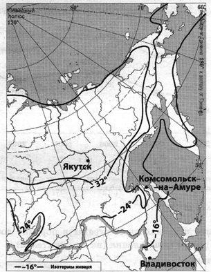 Вопрос id:414976 Тема/шкала: 22.Природные ресурсы С помощью карты сравните средние температуры января в городах Якутск, Владивосток и Комсомольск-на-Амуре. Расположите эти города в порядке понижения средне январских температур.