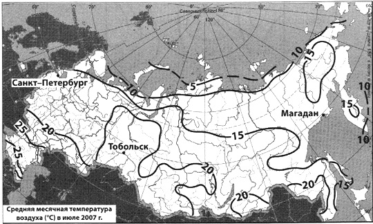Запишите получившуюся последовательность букв. Вопрос id:414979 Тема/шкала: 22.Природные ресурсы С помощью карты сравните средние июльские температуры в городах Санкт-Петербург, Тобольск и Магадан. Расположите эти города в порядке понижения средних июльских температур.