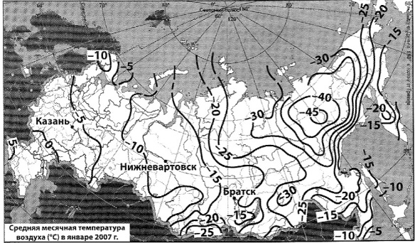 Запишите получившуюся последовательнось букв. Вопрос id:414993 Тема/шкала: 22.Природные ресурсы С помощью карты сравните средние январские температуры в городах Казань, Братск, Нижневартовск. Расположите эти города в порядке повышения средних январских температур.