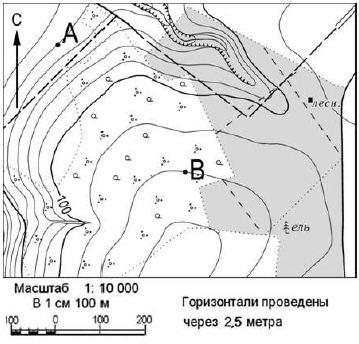 Ответ: _______ м. Вопрос id:415238 Тема/шкала: 26.Географические модели. Карта, план местности Определите по карте расстояние на местности по прямой от точки А до точки В.