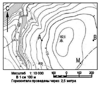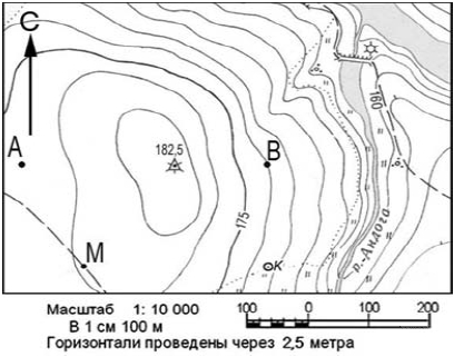 Ответ:_______м. Вопрос id:415245 Тема/шкала: 26.Географические модели. Карта, план местности Определите по карте расстояние на местности по прямой от точки М до отдельно стоящего дерева на высоте 180,4. Полученный результат округлите до десятков метров. Ответ запишите цифрами.