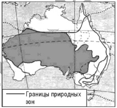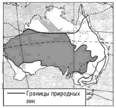 ?) Кавказ ?) Карпаты ?) Саяны ?) Урал Вопрос id:413247 Тема/шкала: 04.Широтная зональность и высотная поясность Какая природная зона обозначена на карте Австралии тёмным цветом?