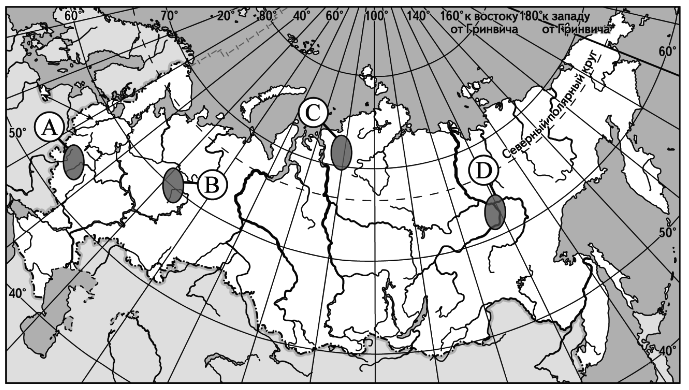?) избыточное увлажнение ?) полынно-злаковая растительность ?) обилие пресмыкающихся ?) каштановые почвы Вопрос id:413267 Тема/шкала: 04.Широтная зональность и высотная поясность Какая из территорий, обозначенных буквами на карте России, находится в пределах природной зоны тундры?