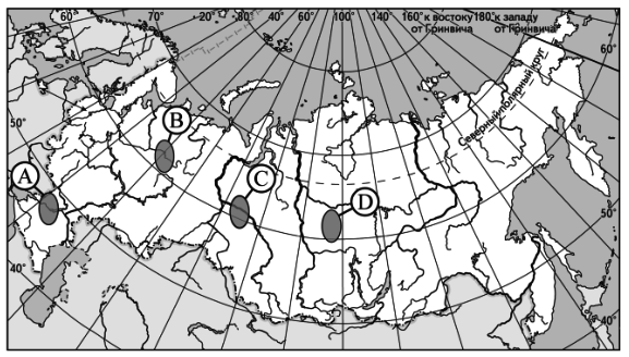 ?) саванн и редколесий ?) широколиственных лесов ?) влажных экваториальных лесов ?) тайги Вопрос id:413270 Тема/шкала: 04.Широтная зональность и высотная поясность Какая из территорий, обозначенных буквами на карте России, находится в пределах природной зоны степей?