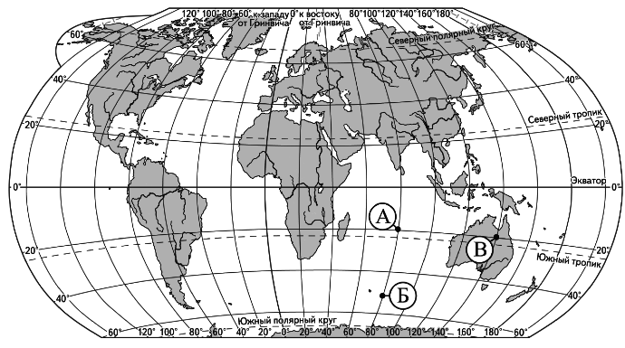 Определите, в какой из этих точек 1 июля Солнце будет находиться выше всего над горизонтом в 8 часов утра по солнечному времени Гринвичского меридиана. Запишите обоснование вашего ответа. Вопрос id:415682 Тема/шкала: 32.Земля как планета, современный облик планеты Определите, в какой из точек, обозначенных буквами на карте, 25 декабря солнце раньше всего по времени Гринвичского меридиана поднимется над горизонтом. Запишите обоснование Вашего ответа.