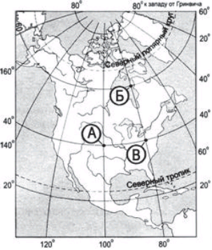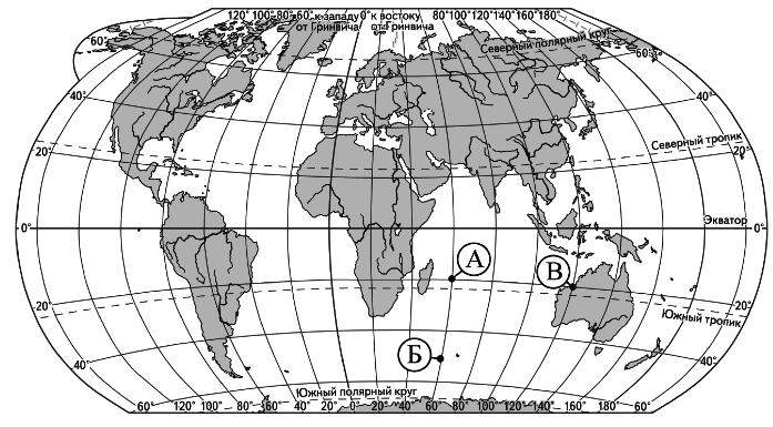 Определите, в какой из этих точек 1 июня Солнце раньше (по времени Гринвичского меридиана) поднимется над горизонтом. Запишите обоснование вашего ответа. Вопрос id:415677 Тема/шкала: 32.Земля как планета, современный облик планеты В день летнего солнцестояния Солнце находится в зените над Северным тропиком. Определите полуденную высоту Солнца над горизонтом в этот день на экваторе и назовите один субъект Российской Федерации, на территории которого в этот же день можно в полдень наблюдать Солнце на такой же высоте, как на экваторе. Обоснуйте свой ответ. Вопрос id:415678 Тема/шкала: 32.Земля как планета, современный облик планеты Географические координаты точек А, Б и В показаны в таблице