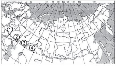 Вопрос id:415695 Тема/шкала: 32.Земля как планета, современный облик планеты Определите, в каком из пунктов, обозначенных цифрами на карте, 1 августа солнце будет находиться ниже всего над горизонтом в 9 часов по солнечному времени Гринвичского меридиана. Запишите обоснование своего ответа.