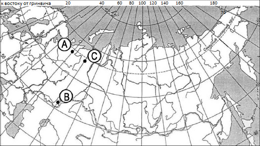 Вопрос id:415712 Тема/шкала: 32.Земля как планета, современный облик планеты Определите, в каком из пунктов, обозначенных буквами на карте России, 1 мая Солнце раньше (по времени Гринвичского меридиана) поднимется над горизонтом. Запишите обоснование вашего ответа.