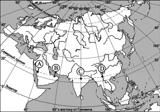 Вопрос id:415734 Тема/шкала: 32.Земля как планета, современный облик планеты Определите, в каком из пунктов, обозначенных буквами на карте Евразии, Солнце будет находиться выше всего над горизонтом 1 декабря в 8 часов по солнечному времени Гринвичского меридиана. Запишите обоснование Вашего ответа.