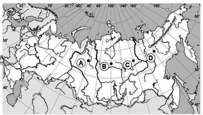 Вопрос id:415736 Тема/шкала: 32.Земля как планета, современный облик планеты Определите, в каком из пунктов, обозначенных буквами на карте России, Солнце будет находиться выше всего над горизонтом 1 августа в 10 часов по солнечному времени Гринвичского меридиана. Запишите обоснование Вашего ответа.