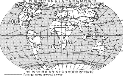 Какой из пунктов, обозначенных буквами на карте, расположен в субтропическом климатическом поясе?