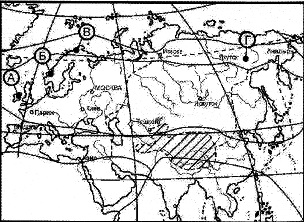 ?) Краснодарский край ?) Астраханская область ?) Республика Калмыкия ?) Республика Карелия Вопрос id:413280 Тема/шкала: 05-Географические особенности России-Климат, климатические пояса России. В какой из точек, обозначенных на карте Евразии, средние температуры января самые низкие?