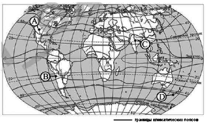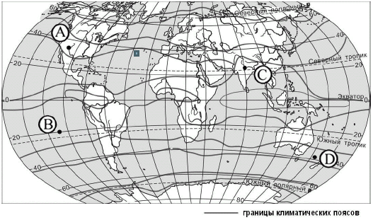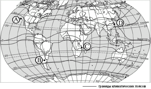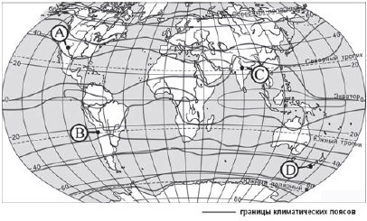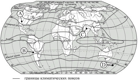 ?) А ?) B ?) D ?) C Вопрос id:413321 Тема/шкала: 05-Географические особенности России-Климат, климатические пояса России. Какой из пунктов, обозначенных буквами на карте мира, расположен в субтропическом климатическом поясе?