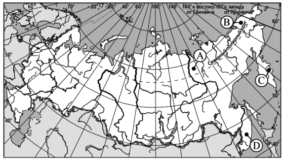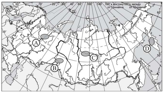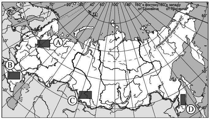 ?) B ?) C ?) D ?) A Вопрос id:413381 Тема/шкала: 05-Географические особенности России- Распространение крупных форм рельефа России. Какой буквой на карте России обозначен вулкан Ключевская Сопка?