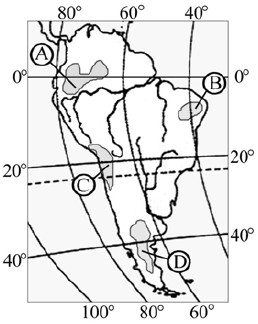 ?) С ?) B ?) D ?) А Вопрос id:413387 Тема/шкала: 05-Географические особенности России-Климат, климатические пояса России. На какой из территорий, обозначенных буквами на карте Южной Америки, среднегодовое количество атмосферных осадков наименьшее?
