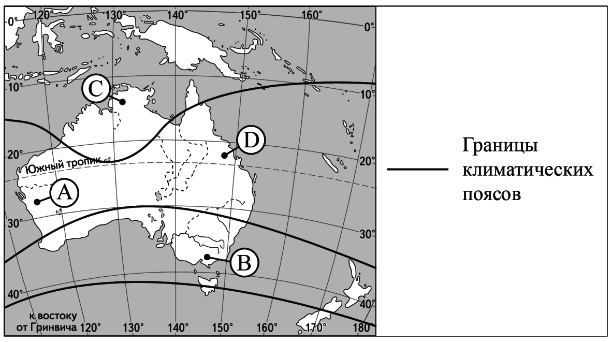 ?) Камчатка ?) Кольский ?) Чукотский ?) Таймыр Вопрос id:413397 Тема/шкала: 05-Географические особенности России-Климат, климатические пояса России. В какой из точек, обозначенных буквами на карте Австралии, средняя температура воздуха в июле наиболее низкая?