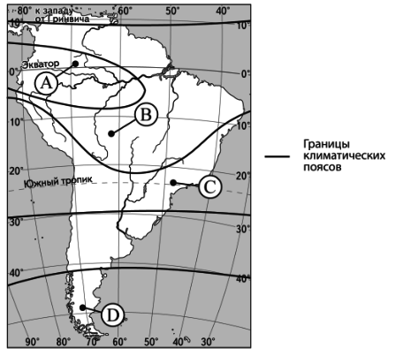 ?) C ?) B ?) A ?) D Вопрос id:413398 Тема/шкала: 05-Географические особенности России-Климат, климатические пояса России. В каком из пунктов, обозначенных буквами на карте Южной Америки, средняя температура воздуха в июле наиболее низкая?