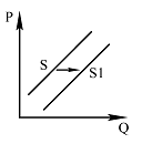 На рисунке отражена ситуация на рынке книжной продукции: линия предложения S переместилась в новое положение S1. (P – цена товара, Q – объем предложения товара)