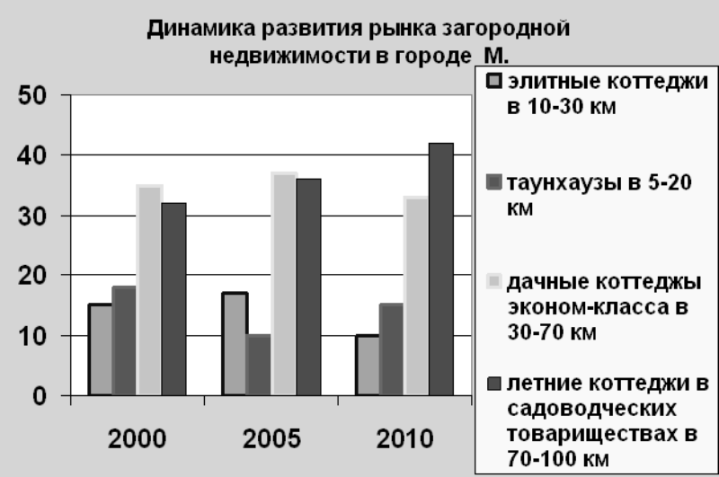 ?) В 2008 году в Российской Федерации расходы потребителей на промышленные товары в структуре семейного бюджета выше, чем расходы на продукты. ?) Более половины расходов семейного бюджета в Российской Федерации в 2008 году составляет оплата услуг ЖКХ и других услуг. ?) Среди расходов семейного бюджета в Российской Федерации в 2008 году доминируют выплаты по счетам жилищно-коммунального хозяйства. ?) Процент расходов на продукты выше, чем значение любой другой категории расходов в структуре семейного бюджета в Российской Федерации в 2008 году. Вопрос id:416582 Тема/шкала: B7-Экономика: задания на анализ графической информации-Графики и диаграммы В течение 2000 – 2010 гг. служба экономического прогнозирования города М. проводила исследование рынка загородной недвижимости. Изучались данные о продажах загородных объектов в крупных агентствах. В результате проведенного исследования был составлен график (в %). Какие выводы можно сделать на основании данной графической информации?