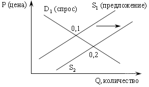 ?) открытием нескольких новых предприятий ?) увеличением налогов, уплачиваемых фирмами ?) увеличением доходов потребителей ?) выдачей льготных кредитов кондитерским предприятиям Вопрос id:416615 Тема/шкала: B7-Экономика: задания на анализ графической информации-Изменение предложения