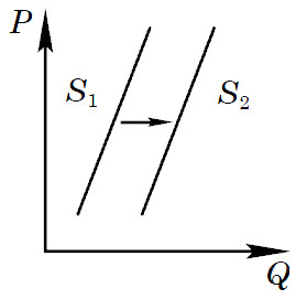 На графике изображено изменение предложения роликовых коньков на потребительском рынке. Что из приведённого ниже могло вызвать сдвиг кривой предложения из положения S1 в положение S2? (На графике P – цена товара, Q – количество товара.).
