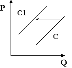 На рисунке отражена ситуация на рынке жестких дисков и флэш-карт: линия предложения С переместилась в новое положение С1. (P – цена товара, Q – объем предложения товара)