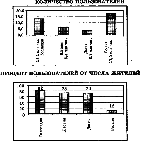 ?) Среди представленных стран Россия занимает первое место по количеству пользователей и последнее место в процентном соотношении. ?) Швеция обгоняет Данию и Россию как по общей численности пользователей Интернетом, так и в процентном отношении. ?) Первое место по количеству пользователей Интернетом принадлежит Голландии, но в процентном отношении она отстает от Швеции и Дании. ?) Занимая третье место в процентном отношении от количества пользователей к общему количеству жителей, Дания опережает Голландию по общему числу пользователей Интернетом. Вопрос id:415891 Тема/шкала: B1-Человек, общество, познание, духовная жизнь-Общество: строение и развитие В диаграмме приведены данные о численности пользователей Интернетом в некоторых европейских странах.