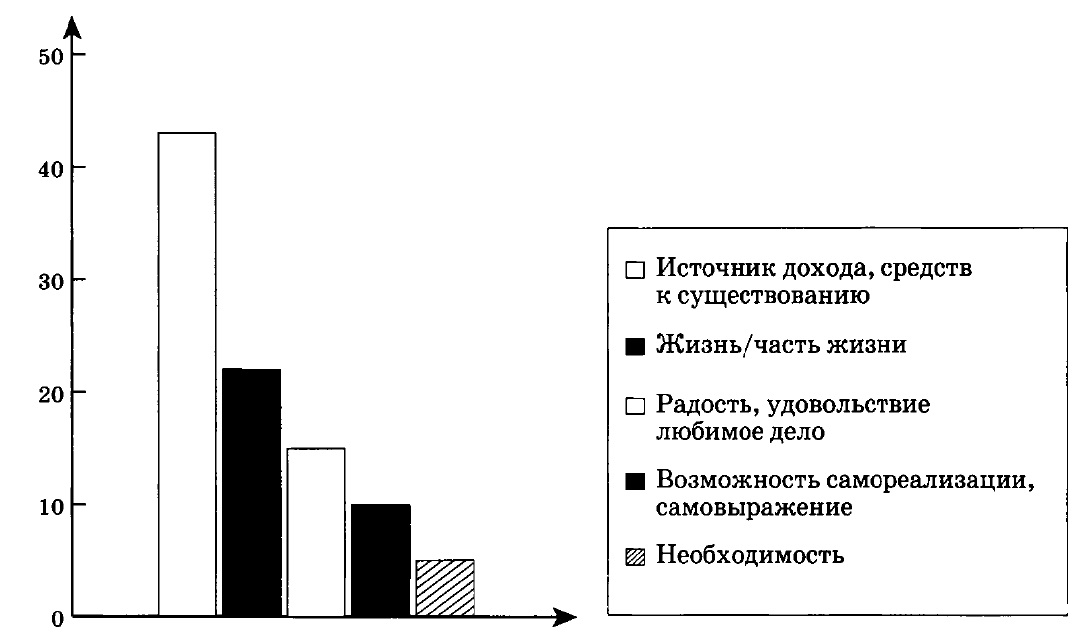 ?) пожить в своё удовольствие, преобладают респонденты из пунктов с населением менее 10 тыс. человек ?) получить хорошую работу, преобладают респонденты из пунктов с населением 100–500 тыс. человек ?) создать семью, преобладают респонденты из пунктов с населением более 500 тыс. человек ?) создать семью, в равной мере представлены респонденты из пунктов с населением 10–100 тыс. и 100–500 тыс. человек Вопрос id:416814 Тема/шкала: B10-Социальные отношения-Задание на обращение к социальным реалиям. Анализ диаграмм В ходе одного из социологических опросов был задан вопрос: «Чем является для вас работа?» Наиболее значимые ответы представлены в приведенной ниже диаграмме (в %). Какой вывод можно сделать на основании данных диаграммы?