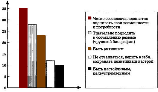 ?) Наибольшее число опрошенных считает работу возможностью самовыразиться и самореализоваться. ?) Для трети опрошенных работа — это часть жизни. ?) Наиболее популярно представление о работе как об источнике средств к существованию. ?) Трети опрошенных работа доставляет удовольствие. Вопрос id:416815 Тема/шкала: B10-Социальные отношения-Задание на обращение к социальным реалиям. Анализ диаграмм В ходе одного из социологических опросов обратились к менеджерам по персоналу и другим представителям кадровых служб предприятий и организаций: «Процесс поиска работы — занятие непростое, нередко требующее от соискателя значительных усилий и терпения. Какой совет Вы дали бы соискателям, чтобы их поиск работы стал максимально эффективным?»