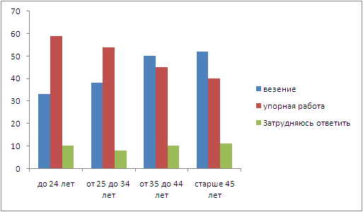 ?) Подавляющее большинство опрошенных обратили внимание на важность активности в поисках работы. ?) Около трети опрошенных посоветовали четко осознать и правильно оценить свои возможности и потребности. ?) Наибольшее число отвечавших отметили тщательность составления резюме. ?) Около четверти опрошенных акцентировали внимание на важность позитивного настроя, веры в себя. Вопрос id:416816 Тема/шкала: B10-Социальные отношения-Задание на обращение к социальным реалиям. Анализ диаграмм В ходе одного из интернет-опросов был задан вопрос: «Как Вы считаете, успешная карьера — это больше везение или упорная работа?» Результаты опроса представлены в приведенной ниже диаграмме (в %).