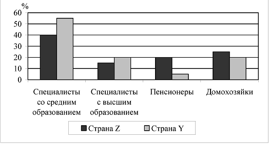 ?) Чуть менее половины опрошенных граждан зрелого возраста считают приоритетным право частной собственности. ?) Наиболее значимы для обеих групп политические права, люди ценят избирательные права. ?) Приоритетным среди прав, отмечаемых молодёжью, признаётся право на свободу вероисповедания. ?) Среди наиболее приоритетных прав граждане обеих групп называют право на личную неприкосновенность. Вопрос id:416836 Тема/шкала: B10-Социальные отношения-Задание на обращение к социальным реалиям. Анализ диаграмм В приведённой ниже диаграмме представлены данные о разных категориях населения стран Z и Y, желающих вновь начать учиться.