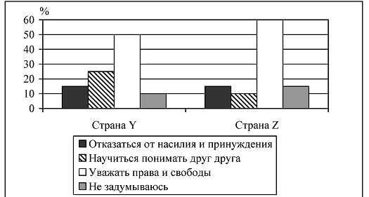 ?) В стране Y среди тех, кто хочет вновь учиться, доля специалистов с высшим образованием выше доли домохозяек. ?) Специалисты со средним образованием обеих стран занимают лидирующее место среди желающих вновь начать учиться. ?) В стране Z равные доли специалистов с высшим образованием и домохозяек желают вновь начать учиться. ?) В стране Z среди желающих вновь начать учиться преобладают пенсионеры. Вопрос id:416837 Тема/шкала: B10-Социальные отношения-Задание на обращение к социальным реалиям. Анализ диаграмм Международная организация проводила в странах Y и Z опрос совершеннолетних граждан. Им задавали вопрос: «Что, по Вашему мнению, необходимо сделать, чтобы избежать межнациональных конфликтов?». Результаты двух опросов представлены в гистограмме.
