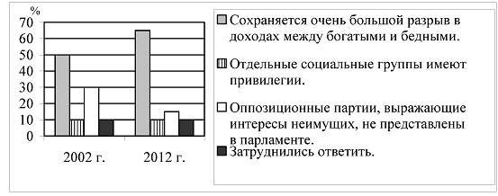 ?) Около 1/3 населения могут быть отнесены к средним слоям общества. ?) Доля среднего класса постоянно растёт. ?) Доля тех, кто проживает за чертой бедности, сокращается. ?) Менее 1/5 населения могут быть отнесены к богатым и высокообеспеченным слоям общества. Вопрос id:416840 Тема/шкала: B10-Социальные отношения-Задание на обращение к социальным реалиям. Анализ диаграмм В стране Z был дважды проведён опрос общественного мнения по одной и той же проблеме. В 2002 г. предлагалось высказаться о проявлениях в обществе социальной несправедливости. Второй опрос состоялся после проведения в стране реформы избирательной системы и системы налогообложения в 2012 г. Результаты опросов (в % от числа опрошенных) представлены в виде диаграммы.
