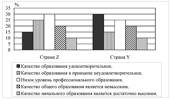 ?) Доля тех, кто считает, что оппозиционные партии, выражающие интересы неимущих, не представлены в парламенте, осталась неизменной. ?) Доля тех, кто отмечает, что сохраняется очень большой разрыв в уровне доходов между богатыми и бедными, выросла. ?) Доля тех, кто считает, что отдельные социальные группы имеют привилегии, сократилась. ?) Четверть опрошенных испытали затруднения при опросе. Вопрос id:416841 Тема/шкала: B10-Социальные отношения-Задание на обращение к социальным реалиям. Анализ диаграмм Социологическими службами стран Z и Y был проведён опрос группы граждан. Был задан вопрос: «Удовлетворены ли Вы качеством образования в стране?». Результаты опроса представлены в виде диаграммы.
