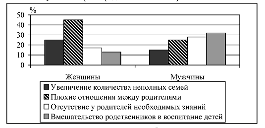 ?) В стране Z каждый третий опрошенный признаёт невысокое качество общего образования. ?) Наименьшие доли опрошенных обеих стран считают высоким качество начального образования. ?) Наибольшие доли опрошенных обеих стран считают качество образования удовлетворительным. ?) Доля людей, удовлетворённых качеством образования, в стране Z больше, чем в стране У. Вопрос id:416842 Тема/шкала: B10-Социальные отношения-Задание на обращение к социальным реалиям. Анализ диаграмм Учёные опросили группу 45-летних жителей страны Z. Женщинам и мужчинам задавали вопрос: «Почему снижается воспитательный потенциал семьи?». Результаты опроса представлены в гистограмме.