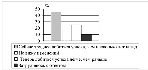 ?) И мужчины, и женщины считают главной причиной снижения воспитательного потенциала семьи увеличение количества неполных семей. ?) Одинаковая доля опрошенных мужчин и женщин рассматривают вмешательство родственников в воспитание детей как причину снижения воспитательного потенциала семьи. ?) Меньшая доля мужчин, по сравнению с женщинами, указывают в качестве причины снижения воспитательного потенциала семьи отсутствие у родителей необходимых знаний. ?) Женщины в большей степени, чем мужчины, связывают снижение воспитательного потенциала семьи с плохими отношениями между родителями. Вопрос id:416843 Тема/шкала: B10-Социальные отношения-Задание на обращение к социальным реалиям. Анализ диаграмм Центр изучения общественного мнения опубликовал данные опроса «Сложно ли добиться успеха в жизни?». Некоторые из них представлены ниже в виде диаграммы.