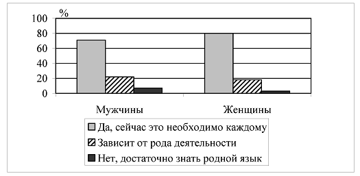 ?) Тех, кто демонстрирует отсутствие интереса к данной проблеме, в стране Y больше, чем в стране Z. ?) Большинство опрошенных в каждой из стран считают необходимым отказаться от насилия и принуждения. ?) Большинство опрошенных в стране Z считают, что прежде всего необходимо уважать права и свободы. ?) Среди тех, кто считает, что необходимо научиться понимать друг друга, больше жителей страны Z, чем страны Y. Вопрос id:416838 Тема/шкала: B10-Социальные отношения-Задание на обращение к социальным реалиям. Анализ диаграмм В Европейский день языков, учреждённый Советом Европы, изучались мнения жителей страны Z о том, необходимо ли современному человеку владение иностранными языками. Полученные данные (в % от числа опрошенных) представлены в графической форме.