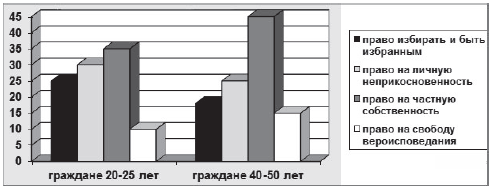 ?) четверть опрошенных представителей старшего поколения способна оформить кредит на покупку жилья ?) среди представителей молодого поколения в два раза больше тех, кто может приобрести дачный дом, чем среди людей старшего возраста ?) подавляющее большинство среди обеих групп опрошенных способны приобрести новый автомобиль ?) почти треть опрошенной молодежи не может заработать на продукты питания и оплату коммунальных услуг Вопрос id:416853 Тема/шкала: B10-Социальные отношения-Задание на обращение к социальным реалиям. Анализ таблиц Социологические службы страны Z провели среди граждан двух возрастных групп (20-25 лет и 40-50 лет) опрос для выяснения их отношения к гражданским правам. Респондентам был задан вопрос: «Какие права Вы считаете наиболее значимыми для Вас?».