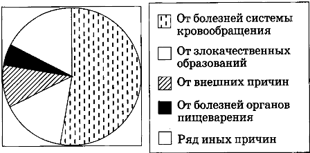 ?) Как в 2005, так и в 2007 году среди всех категорий опрошенных доминировали респонденты, удовлетворенные качеством жилищно-коммунальных услуг. ?) Число респондентов, не удовлетворенных качеством жилищно-коммунальных услуг, к 2007 году уменьшилось. ?) Число респондентов, полностью удовлетворенных качеством жилищно-коммунальных услуг, в 2007 году составило треть опрошенных. ?) Число респондентов, удовлетворенных качеством жилищно-коммунальных услуг, в 2007 году меньше, чем в 2005. Вопрос id:416823 Тема/шкала: B10-Социальные отношения-Задание на обращение к социальным реалиям. Анализ диаграмм Росстат опубликовал данные о причинах смертности в 2010 году. Они представлены в приведенной ниже диаграмме.