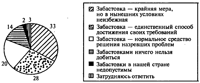 ?) В трети летальных случаев прослеживается связь с заболеваниями органов пищеварения. ?) Злокачественные образования привели к меньшему числу летальных исходов, чем болезни органов пищеварения. ?) Внешними по отношению к человеку причинами обусловлены около четверти смертных случаев. ?) Наиболее важный фактор риска для здоровья — болезни системы кровообращения. Вопрос id:416824 Тема/шкала: B10-Социальные отношения-Задание на обращение к социальным реалиям. Анализ диаграмм Левада-Центр, занимающийся изучением общественного мнения в РФ, проводил социологический опрос на тему: «Какое из следующих мнений о забастовках вам ближе всего?» (Опрос 2004 г., 1600 человек.) Полученные результаты (в процентах от общего числа участников) отражены в диаграмме.