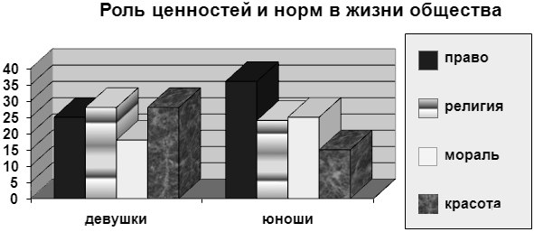 ?) Абсолютное большинство опрошенных не считают уступку эффективным способом поведения в конфликте. ?) Более половины опрошенных считают, что пос редничество государства необходимо для разрешения конфликта. ?) Меньше опрошенных считают эффективным «замораживание» конфликта, чем уступку одной из сторон конфликта. ?) Больше опрошенных считают эффективным дли тельное противоборство в конфликте, чем отказ всех конфликтующих сторон от взаимных пре тензий. Вопрос id:416827 Тема/шкала: B10-Социальные отношения-Задание на обращение к социальным реалиям. Анализ диаграмм В стране Н. проводился опрос среди молодежи. Юношам и девушкам социологи задавали вопрос: «Какие социальные ценности и нормы вы считаете наиболее значимыми в жизни общества?» Результаты опроса (в % от числа опрошенных) представлены в виде диаграммы.