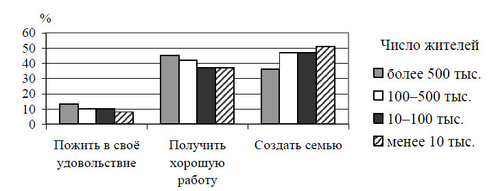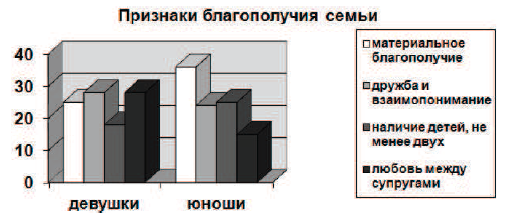 ?) пожить в своё удовольствие, преобладают респонденты из пунктов с населением менее 10 тыс. человек ?) получить хорошую работу, преобладают респонденты из пунктов с населением 100–500 тыс. человек ?) создать семью, преобладают респонденты из пунктов с населением более 500 тыс. человек ?) создать семью, в равной мере представлены респонденты из пунктов с населением 10–100 тыс. и 100–500 тыс. человек Вопрос id:416831 Тема/шкала: B10-Социальные отношения-Задание на обращение к социальным реалиям. Анализ диаграмм В стране Н. проводился опрос среди молодежи. Юношам и девушкам социологи задавали вопрос: «Какие признаки семьи Вы считаете необходимыми для семейного благополучия и счастья?» Результаты опроса (в % от числа опрошенных) представлены в виде диаграммы. Какие выводы можно сделать на основании информации, приведённой в диаграмме?