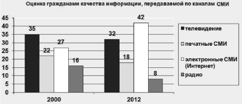 ?) Наиболее значимы для обеих групп права на свободу вероисповедания, свободу совести. ?) Наибольшие доли опрошенных в обеих группах в качестве приоритетных прав отметили право на частную собственность. ?) Чуть менее половины опрошенных граждан зрелого возраста считают наиболее важным право избирать и быть избранным. ?) Граждане не рассматривают в числе значимых для себя право на личную неприкосновенность. Вопрос id:416834 Тема/шкала: B10-Социальные отношения-Задание на обращение к социальным реалиям. Анализ диаграмм Социологические службы страны М. проводили на протяжении ряда лет исследование предпочтений граждан в обращении к материалам СМИ. Гражданам задавался вопрос: «В каких средствах массовой информации информация Вам представляется наиболее качественной и достоверной?». На основании проведённых опросов была составлена диаграмма (в %).