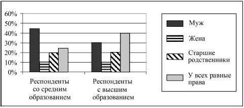 ?) Более трети опрошенных самым нужным для начала бизнеса считают наличие денег и связей. ?) Половина респондентов уверены, что для успешного бизнеса необходимы образование, опыт работы в данной сфере, полная самоотдача и связи. ?) Четверть респондентов уверены, что для начала бизнеса нужны только деньги. ?) Большинство опрошенных считает, что, начиная бизнес, нужно иметь новые идеи. Вопрос id:416846 Тема/шкала: B10-Социальные отношения-Задание на обращение к социальным реалиям. Анализ диаграмм В ходе социологического опроса группы 25-летних граждан страны Z респондентам с разным уровнем образования задавали вопрос: «Кто должен быть главой семьи?». Результаты опроса (в % от числа отвечавших) представлены в диаграмме.